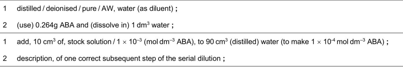 A student investigated the effect of gibberellin(GA)and abscisic acid(ABA)on the germination of wheat grains. The student found out the following information. -The molecular mass of GA is 346 g . -The molecular mass of ABA is 264 g . -The range of concentrations at which GA is active in plant tissues is from $$\(1 \times 10^{-6}\)$$ to $$\(1 \times 10^{-5} \mathrm{moldm}^{-3}\)$$ . -The range of concentrations at which ABA is active in plant tissues is from $$\(1 \times 10^{-6}\)$$ to $$\(1 \times 10^{-4} \mathrm{moldm}^{-3}\)$$ . -Newly formed wheat grains contain a high concentration of ABA which decreases over time. -When the concentration of ABA falls low enough the GA is able to promote germination. -Wheat germinates best at temperatures from $$\(10^{\circ} \mathrm{C}\)$$ to $$\(25^{\circ} \mathrm{C}\)$$ and without light. Fig. 1.1 shows the germination and early growth of wheat. To test the effects on germination of adding $$\(A B A\)$$ ,the student started by soaking wheat grains for 24 hours in a solution of $$\(1 \times 10^{-6} \mathrm{~mol}^{-3} \mathrm{GA}\)$$ .These were then split into several groups of 50 grains and a different concentration of ABA was added to each group. The student made a stock solution of ABA with a concentration of $$\(1 \times 10^{-3} \mathrm{~mol} \mathrm{dm}^{-3}\)$$ which was then diluted to make the solutions needed for the investigation. (a)(i)Using the information about ABA above,describe how the student made a stock solution of $$\(1 \times 10^{-3} \mathrm{~mol} \mathrm{dm}^{-3} \mathrm{ABA}\)$$ . . . . (ii) The student used the stock solution of $$\(1 \times 10^{-3} \mathrm{~mol} \mathrm{dm}^{-3} \mathrm{ABA}\)$$ to prepare a range of dilutions from $$\(1 \times 10^{-4} \mathrm{~mol} \mathrm{dm}^{-3}\)$$ to $$\(1 \times 10^{-7} \mathrm{~mol} \mathrm{dm}^{-3}\)$$ to use in their investigation. Each dilution had a volume of $$\(100 \mathrm{~cm}^{3}\)$$. Describe how the student prepared these dilutions. . . .