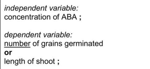 A student investigated the effect of gibberellin(GA)and abscisic acid(ABA)on the germination of wheat grains. The student found out the following information. -The molecular mass of GA is 346 g . -The molecular mass of ABA is 264 g . -The range of concentrations at which GA is active in plant tissues is from $$\(1 \times 10^{-6}\)$$ to $$\(1 \times 10^{-5} \mathrm{moldm}^{-3}\)$$ . -The range of concentrations at which ABA is active in plant tissues is from $$\(1 \times 10^{-6}\)$$ to $$\(1 \times 10^{-4} \mathrm{moldm}^{-3}\)$$ . -Newly formed wheat grains contain a high concentration of ABA which decreases over time. -When the concentration of ABA falls low enough the GA is able to promote germination. -Wheat germinates best at temperatures from $$\(10^{\circ} \mathrm{C}\)$$ to $$\(25^{\circ} \mathrm{C}\)$$ and without light. Fig. 1.1 shows the germination and early growth of wheat. To test the effects on germination of adding $$\(A B A\)$$ ,the student started by soaking wheat grains for 24 hours in a solution of $$\(1 \times 10^{-6} \mathrm{~mol}^{-3} \mathrm{GA}\)$$ .These were then split into several groups of 50 grains and a different concentration of ABA was added to each group. The student made a stock solution of ABA with a concentration of $$\(1 \times 10^{-3} \mathrm{~mol} \mathrm{dm}^{-3}\)$$ which was then diluted to make the solutions needed for the investigation. Identify the independent and the dependent variables in this investigation. independent variable dependent variable (ii) Describe a procedure that the student could use to complete the investigation to find the effect of different concentrations of ABA on the germination of wheat grains. Your method should be detailed enough for another person to use and should not repeat any details from (a)(ii) of how to dilute the stock solution. . . . . . . . . . . . . . . .