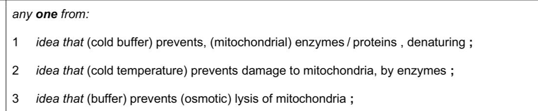 A student investigated the oxygen consumption of isolated mitochondria under different conditions. Mitochondria were isolated by crushing liver cells in ice cold buffer and filtering to remove cell debris.The filtrate was centrifuged to separate the mitochondria.The mitochondria were suspended in ice cold buffer. (a)State one reason for keeping the mitochondria in cold buffer solution during isolation. . [1] Fig. 2.1 shows the apparatus used to measure the oxygen consumption of the isolated mitochondria. During this procedure the oxygen concentration in the chamber was measured continuously and displayed as a trace on the computer screen as shown in Fig. 2.2. Using the figures from the trace, the computer calculated the rate of oxygen consumption following each addition. This procedure was repeated three more times using fresh samples of mitochondria. Table 2.1 shows the rates of oxygen consumption for each of the four trials.