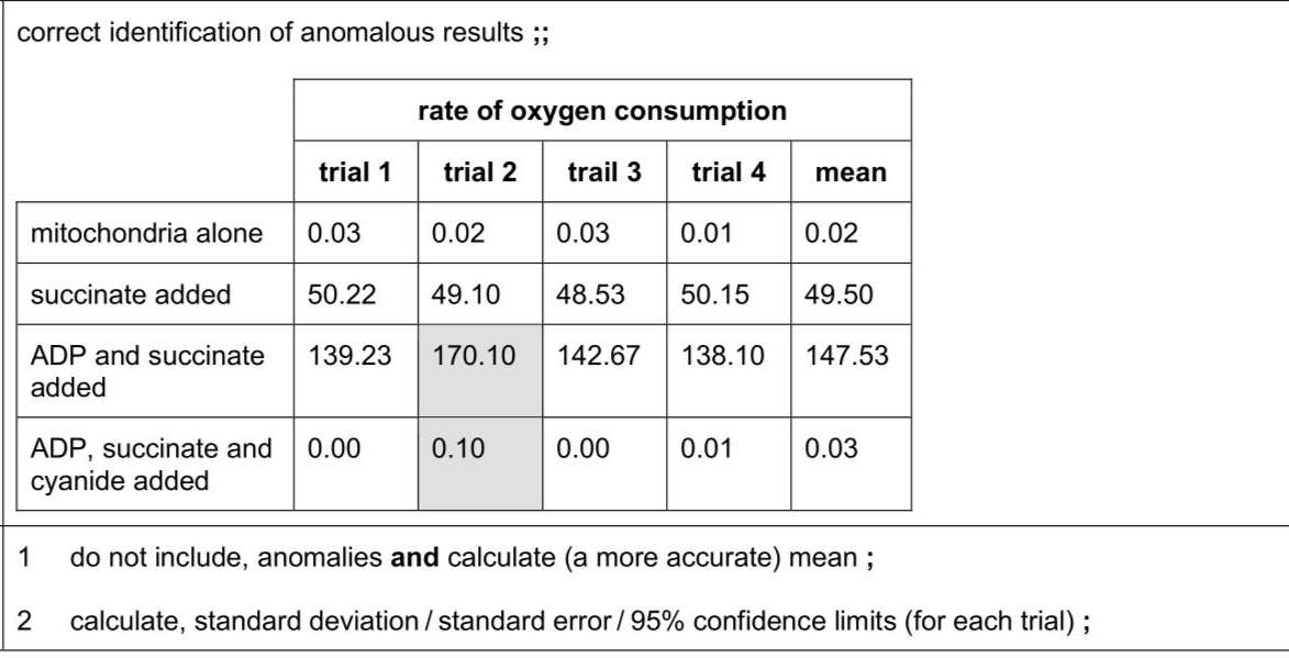 A student investigated the oxygen consumption of isolated mitochondria under different conditions. Mitochondria were isolated by crushing liver cells in ice cold buffer and filtering to remove cell debris.The filtrate was centrifuged to separate the mitochondria.The mitochondria were suspended in ice cold buffer. Calculate the mean rate of oxygen consumption for mitochondria with succinate. Write your answer in Table 2.1. (ii) On Table 2.1 indicate, by placing a circle around each value, two results that may be anomalous. (iii) State two ways that the student could have processed the results to allow for these possible anomalies. . . .