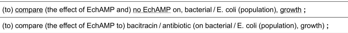 Echidnas are mammals that live in Australia and New Guinea. Scientists analysed the milk produced by female echidnas and identified a protein that they named EchAMP.The scientists predicted that EchAMP may have antibacterial properties. The scientists tested the effect of EchAMP on the bacterium Escherichia coli. 1. 100 E.coli cells were added to each well on a cell culture plate with 96 wells. 2.A treatment solution that contained EchAMP was added to each well on the plate. 3.A chemical that causes living E.coli cells to fluoresce was added to each well. 4.The plate was incubated at $$\(37^{\circ} \mathrm{C}\)$$ . 5.Every hour for 7 hours,the fluorescence emitted by the E.coli on the plate was recorded as a measure of E.coli population growth. 6.Steps $$\(1-5\)$$ were repeated eight times. The scientists also carried out two control experiments. -A negative control experiment repeated the procedure(steps $$\(1-6\)$$ ),but the treatment solution did not contain EchAMP. -A positive control experiment repeated the procedure(steps 1-6),but the treatment solution contained an antibiotic called bacitracin instead of EchAMP. Explain why the scientists included the negative control experiment in their investigation. . . (ii) Explain why the scientists included the positive control experiment in their investigation. . .
