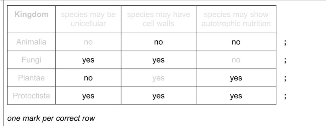 Organisms are classified in three domains. The domain Eukarya is divided into four kingdoms. The four eukaryotic kingdoms are listed in Table 4.1. Complete Table 4.1 by writing 'yes' or 'no' to produce a summary of some of the main features of each kingdom.