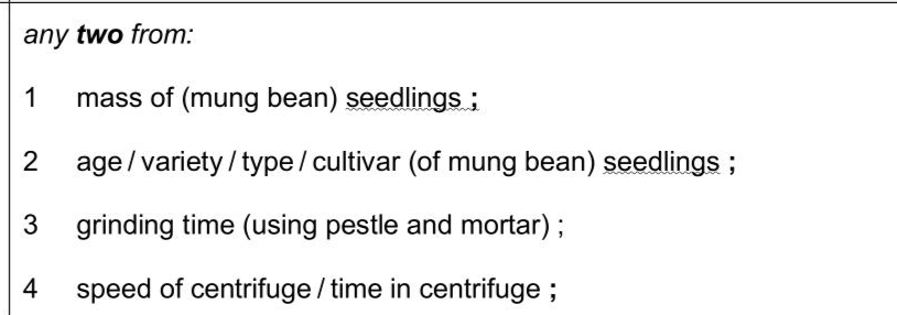 Phosphatases are enzymes that catalyse the removal of phosphate from other molecules, releasing inorganic phosphate ( $$\(\mathrm{P}_{\mathrm{i}}\)$$ ). A phosphatase can be extracted from mung bean seedlings, Vigna radiata. A student found a published method to extract phosphatase from mung bean seedlings. - Use a pestle and mortar to grind mung bean seedlings, with a small volume of distilled water, to make a paste. - Add distilled water to the paste to make a mixture with a total volume of $$\(50 \mathrm{~cm}^{3}\)$$. - Filter the mixture and put the filtrate into a clean centrifuge tube. - Centrifuge the filtrate until a solid pellet is formed, as shown in Fig. 1.2. - Pour the liquid extract containing phosphatase into a clean test-tube. State two other variables that should be standardised in the published method so that extracts with the same concentration of phosphatase can be produced. . . . .