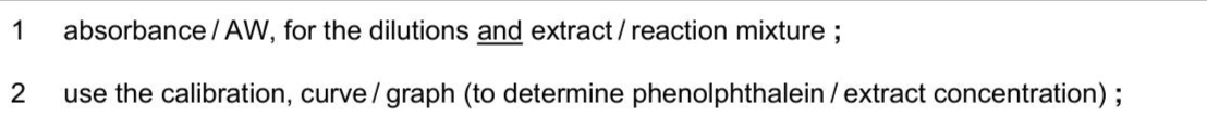 Phosphatases are enzymes that catalyse the removal of phosphate from other molecules, releasing inorganic phosphate ( $$\(\mathrm{P}_{\mathrm{i}}\)$$ ). A phosphatase can be extracted from mung bean seedlings, Vigna radiata. A student found a published method to extract phosphatase from mung bean seedlings. - Use a pestle and mortar to grind mung bean seedlings, with a small volume of distilled water, to make a paste. - Add distilled water to the paste to make a mixture with a total volume of $$\(50 \mathrm{~cm}^{3}\)$$. - Filter the mixture and put the filtrate into a clean centrifuge tube. - Centrifuge the filtrate until a solid pellet is formed, as shown in Fig. 1.2. - Pour the liquid extract containing phosphatase into a clean test-tube. Describe how the student could use the dilutions from (c) and a colorimeter to estimate the concentration of phenolphthalein in a reaction mixture. . . . .