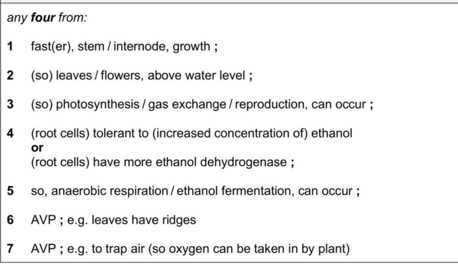 The grass Oryza sativa is grown as a food crop to produce rice. Rice plants are adapted to grow with their roots submerged in water. Describe and explain two other adaptations of rice plants to growing in flooded fields. . . . . . .