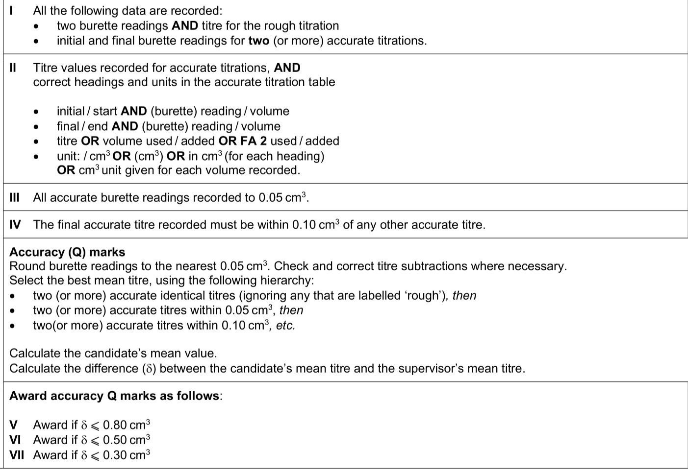 Hydrogen peroxide, $$\(\mathrm{H}_{2} \mathrm{O}_{2}\)$$, reacts rapidly with acidified potassium manganate(VII), $$\(\mathrm{KMnO}_{4}\)$$. $$\[ 5 \mathrm{H}_{2} \mathrm{O}_{2}(\mathrm{aq})+2 \mathrm{MnO}_{4}^{-}(\mathrm{aq})+6 \mathrm{H}^{+}(\mathrm{aq}) \rightarrow 5 \mathrm{O}_{2}(\mathrm{~g})+8 \mathrm{H}_{2} \mathrm{O}(\mathrm{l})+2 \mathrm{Mn}^{2+}(\mathrm{aq}) \]$$ You will determine the concentration of a solution of hydrogen peroxide. You will first dilute the solution and then carry out a titration with acidified potassium manganate(VII). FA 1 is aqueous hydrogen peroxide, $$\(\mathrm{H}_{2} \mathrm{O}_{2}\)$$. FA 2 is $$\(0.0300 \mathrm{~mol} \mathrm{dm}^{-3}\)$$ potassium manganate(VII), $$\(\mathrm{KMnO}_{4}\)$$. FA 3 is $$\(1.0 \mathrm{~mol} \mathrm{dm}^{-3}\)$$ sulfuric acid, $$\(\mathrm{H}_{2} \mathrm{SO}_{4}\)$$.