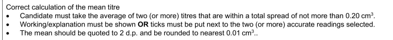 Hydrogen peroxide, $$\(\mathrm{H}_{2} \mathrm{O}_{2}\)$$, reacts rapidly with acidified potassium manganate(VII), $$\(\mathrm{KMnO}_{4}\)$$. $$\[ 5 \mathrm{H}_{2} \mathrm{O}_{2}(\mathrm{aq})+2 \mathrm{MnO}_{4}^{-}(\mathrm{aq})+6 \mathrm{H}^{+}(\mathrm{aq}) \rightarrow 5 \mathrm{O}_{2}(\mathrm{~g})+8 \mathrm{H}_{2} \mathrm{O}(\mathrm{l})+2 \mathrm{Mn}^{2+}(\mathrm{aq}) \]$$ You will determine the concentration of a solution of hydrogen peroxide. You will first dilute the solution and then carry out a titration with acidified potassium manganate(VII). FA 1 is aqueous hydrogen peroxide, $$\(\mathrm{H}_{2} \mathrm{O}_{2}\)$$. FA 2 is $$\(0.0300 \mathrm{~mol} \mathrm{dm}^{-3}\)$$ potassium manganate(VII), $$\(\mathrm{KMnO}_{4}\)$$. FA 3 is $$\(1.0 \mathrm{~mol} \mathrm{dm}^{-3}\)$$ sulfuric acid, $$\(\mathrm{H}_{2} \mathrm{SO}_{4}\)$$. From your accurate titration results, calculate a suitable mean value to use in your calculations. Show clearly how you obtain the mean value. $$\(25.0 \mathrm{~cm}^{3}\)$$ of FA 4 required $$\(\mathrm{cm}^{3}\)$$ of FA 2.