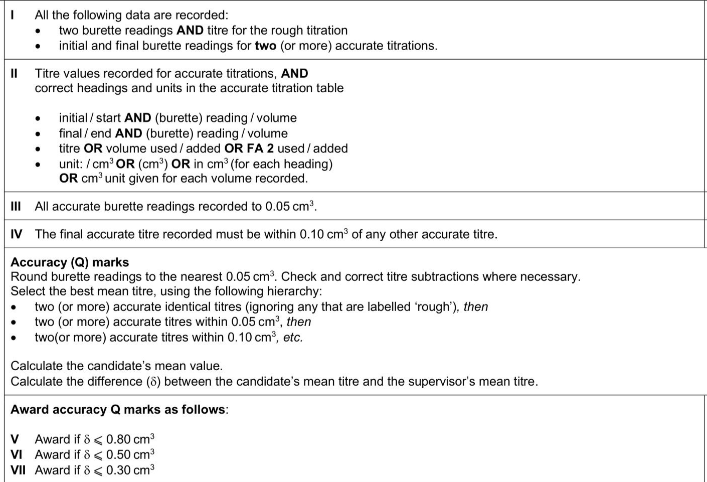 Hydrogen peroxide, $$\(\mathrm{H}_{2} \mathrm{O}_{2}\)$$, reacts rapidly with acidified potassium manganate(VII), $$\(\mathrm{KMnO}_{4}\)$$. $$\[ 5 \mathrm{H}_{2} \mathrm{O}_{2}(\mathrm{aq})+2 \mathrm{MnO}_{4}^{-}(\mathrm{aq})+6 \mathrm{H}^{+}(\mathrm{aq}) \rightarrow 5 \mathrm{O}_{2}(\mathrm{~g})+8 \mathrm{H}_{2} \mathrm{O}(\mathrm{l})+2 \mathrm{Mn}^{2+}(\mathrm{aq}) \]$$ You will determine the concentration of a solution of hydrogen peroxide. You will first dilute the solution and then carry out a titration with acidified potassium manganate(VII). FA 1 is aqueous hydrogen peroxide, $$\(\mathrm{H}_{2} \mathrm{O}_{2}\)$$. FA 2 is $$\(0.0300 \mathrm{~mol} \mathrm{dm}^{-3}\)$$ potassium manganate(VII), $$\(\mathrm{KMnO}_{4}\)$$. FA 3 is $$\(1.0 \mathrm{~mol} \mathrm{dm}^{-3}\)$$ sulfuric acid, $$\(\mathrm{H}_{2} \mathrm{SO}_{4}\)$$. - Pipette $$\(25.0 \mathrm{~cm}^{3}\)$$ of FA 1 into the $$\(250 \mathrm{~cm}^{3}\)$$ volumetric flask. - Add distilled water to make $$\(250 \mathrm{~cm}^{3}\)$$ of solution. - Shake the flask thoroughly. - Label this diluted solution of hydrogen peroxide FA 4. - Fill the burette with FA 2. - Rinse the $$\(25.0 \mathrm{~cm}^{3}\)$$ pipette with distilled water and then with FA 4. - Pipette $$\(25.0 \mathrm{~cm}^{3}\)$$ of FA 4 into a conical flask. - Use the $$\(25 \mathrm{~cm}^{3}\)$$ measuring cylinder to add $$\(10 \mathrm{~cm}^{3}\)$$ of FA 3 to the conical flask. - Perform a rough titration and record your burette readings in the space below. The rough titre is = $$\(\mathrm{cm}^{3}\)$$. - Carry out as many accurate titrations as you think necessary to obtain consistent results. - Make sure your recorded results show the precision of your practical work. - Record, in a suitable form in the space for results, all your burette readings and the volume of FA 2 added in each accurate titration.