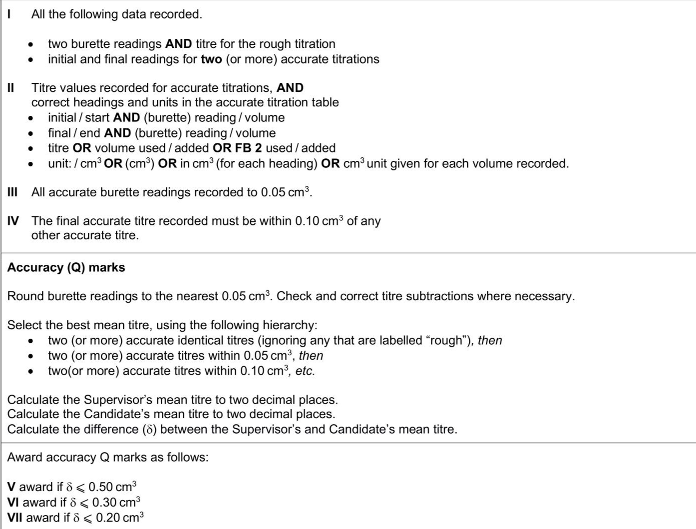 Iron is an element that is essential in the human diet. Some people need to take iron supplement tablets to ensure an adequate intake of iron. You will investigate the mass of iron in an iron supplement tablet by titrating a solution with potassium manganate(VII). $$\[ \begin{gathered} \mathrm{Fe}^{2+}(\mathrm{aq}) \rightarrow \mathrm{Fe}^{3+}(\mathrm{aq})+\mathrm{e}^{-} \\ \mathrm{MnO}_{4}^{-}(\mathrm{aq})+8 \mathrm{H}^{+}(\mathrm{aq})+5 \mathrm{e}^{-} \rightarrow \mathrm{Mn}^{2+}(\mathrm{aq})+4 \mathrm{H}_{2} \mathrm{O}(\mathrm{l}) \end{gathered} \]$$ FB 1 is an aqueous solution of iron supplement tablets made by dissolving 14 tablets in $$\(1.00 \mathrm{dm}^{3}\)$$ of solution. The iron in each tablet is iron(II) sulfate, $$\(\mathrm{FeSO}_{4} \bullet 7 \mathrm{H}_{2} \mathrm{O}\)$$. FB 2 is $$\(0.0100 \mathrm{~mol} \mathrm{dm}^{-3}\)$$ acidified aqueous potassium manganate(VII), $$\(\mathrm{KMnO}_{4}\)$$. FB 3 is dilute sulfuric acid, $$\(\mathrm{H}_{2} \mathrm{SO}_{4}\)$$. Method - Fill a burette with FB 2. - Pipette $$\(25.0 \mathrm{~cm}^{3}\)$$ of FB 1 into a conical flask. - Use the $$\(25 \mathrm{~cm}^{3}\)$$ measuring cylinder to add $$\(10.0 \mathrm{~cm}^{3}\)$$ of FB 3 to the conical flask. - Perform a rough titration and record your burette readings in the space below. The rough titre is $$\(\mathrm{cm}^{3}\)$$. - Carry out as many accurate titrations as you think necessary to obtain consistent results. - Make sure any recorded results show the precision of your practical work. - Record, in a suitable form in the space below, all your burette readings and the volume of FB 2 added in each accurate titration.