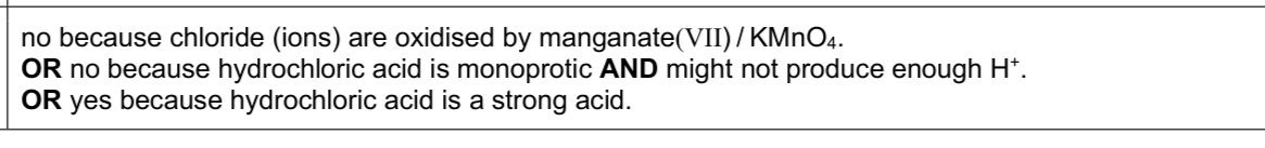 Iron is an element that is essential in the human diet. Some people need to take iron supplement tablets to ensure an adequate intake of iron. You will investigate the mass of iron in an iron supplement tablet by titrating a solution with potassium manganate(VII). $$\[ \begin{gathered} \mathrm{Fe}^{2+}(\mathrm{aq}) \rightarrow \mathrm{Fe}^{3+}(\mathrm{aq})+\mathrm{e}^{-} \\ \mathrm{MnO}_{4}^{-}(\mathrm{aq})+8 \mathrm{H}^{+}(\mathrm{aq})+5 \mathrm{e}^{-} \rightarrow \mathrm{Mn}^{2+}(\mathrm{aq})+4 \mathrm{H}_{2} \mathrm{O}(\mathrm{l}) \end{gathered} \]$$ FB 1 is an aqueous solution of iron supplement tablets made by dissolving 14 tablets in $$\(1.00 \mathrm{dm}^{3}\)$$ of solution. The iron in each tablet is iron(II) sulfate, $$\(\mathrm{FeSO}_{4} \bullet 7 \mathrm{H}_{2} \mathrm{O}\)$$. FB 2 is $$\(0.0100 \mathrm{~mol} \mathrm{dm}^{-3}\)$$ acidified aqueous potassium manganate(VII), $$\(\mathrm{KMnO}_{4}\)$$. FB 3 is dilute sulfuric acid, $$\(\mathrm{H}_{2} \mathrm{SO}_{4}\)$$. A student used all the FB 3 and suggests that dilute hydrochloric acid would be a suitable replacement. Suggest whether the student is correct or not. Explain your answer. . .
