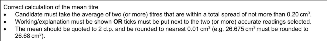 Iron is an element that is essential in the human diet. Some people need to take iron supplement tablets to ensure an adequate intake of iron. You will investigate the mass of iron in an iron supplement tablet by titrating a solution with potassium manganate(VII). FB 1 is an aqueous solution of iron supplement tablets made by dissolving 14 tablets in $$\(1.00 \mathrm{dm}^{3}\)$$ of solution. The iron in each tablet is iron(II) sulfate, $$\(\mathrm{FeSO}_{4} \bullet 7 \mathrm{H}_{2} \mathrm{O}\)$$. FB 2 is $$\(0.0100 \mathrm{~mol} \mathrm{dm}^{-3}\)$$ acidified aqueous potassium manganate(VII), $$\(\mathrm{KMnO}_{4}\)$$. FB 3 is dilute sulfuric acid, $$\(\mathrm{H}_{2} \mathrm{SO}_{4}\)$$. From your accurate titration results, calculate a suitable mean value to use in your calculations. Show clearly how you obtain the mean value. $$\(25.0 \mathrm{~cm}^{3}\)$$ of FB 1 required $$\(\mathrm{cm}^{3}\)$$ of FB 2.