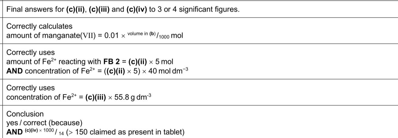 Iron is an element that is essential in the human diet. Some people need to take iron supplement tablets to ensure an adequate intake of iron. You will investigate the mass of iron in an iron supplement tablet by titrating a solution with potassium manganate(VII). FB 1 is an aqueous solution of iron supplement tablets made by dissolving 14 tablets in $$\(1.00 \mathrm{dm}^{3}\)$$ of solution. The iron in each tablet is iron(II) sulfate, $$\(\mathrm{FeSO}_{4} \bullet 7 \mathrm{H}_{2} \mathrm{O}\)$$. FB 2 is $$\(0.0100 \mathrm{~mol} \mathrm{dm}^{-3}\)$$ acidified aqueous potassium manganate(VII), $$\(\mathrm{KMnO}_{4}\)$$. FB 3 is dilute sulfuric acid, $$\(\mathrm{H}_{2} \mathrm{SO}_{4}\)$$. Give your answers to (c)(ii), (c)(iii) and (c)(iv) to an appropriate number of significant figures. (ii) Calculate the amount, in mol, of manganate(VII) ions in the volume of FB 2 in (b). amount of $$\(\mathrm{MnO}_{4}{ }^{-}=\)$$ mol (iii) Use your answer to (c)(ii) and the equations at the start of the question to calculate the concentration, in $$\(\mathrm{mol} \mathrm{dm}^{-3}\)$$, of iron(II) ions in FB 1. concentration of $$\(\mathrm{Fe}^{2+}=\)$$ $$\(\mathrm{mol} \mathrm{dm}^{-3}\)$$ (iv) Use your answer to (c)(iii) to calculate the concentration, in $$\(\mathrm{gdm}^{-3}\)$$, of iron(II) ions in FB 1. concentration of $$\(\mathrm{Fe}^{2+}=\)$$ $$\(\mathrm{g} \mathrm{dm}^{-3}\)$$ (v) The manufacturer of the iron supplement tablets used to make FB 1 claims that each tablet contains a minimum of 150 mg of $$\(\mathrm{Fe}^{2+}\)$$. Use your answer to (c)(iv) and the information given about FB 1 to determine whether this claim is correct. Show your working.