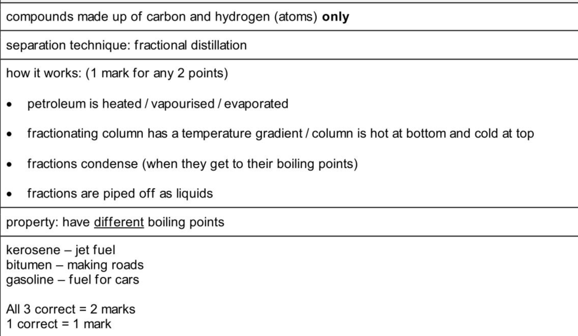 This question is about organic chemistry. State the meaning of the term hydrocarbon. . (ii) Petroleum is a mixture of hydrocarbons. Outline how petroleum is separated into its useful components. Include in your answer: - the name of the separation technique - the property of the hydrocarbons which allows them to be separated - a description of how this technique separates the petroleum into its useful components. . . . . . . . (iii) Some of the products obtained from petroleum are shown. Draw a line from each product to its use.