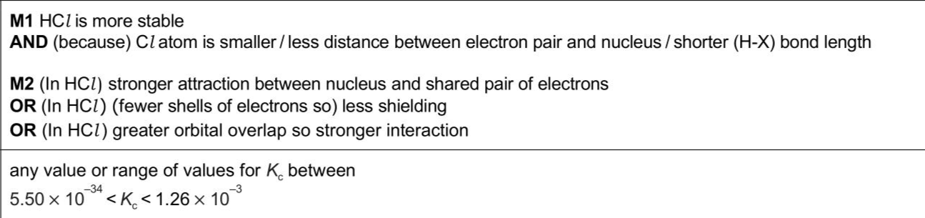 $$\(3 \quad \mathrm{H}_{2}(\mathrm{~g})\)$$ and $$\(\mathrm{I}_{2}(\mathrm{~g})\)$$ react to form $$\(\mathrm{HI}(\mathrm{g})\)$$ in a reversible reaction, as shown in equation 1. In three separate experiments, a student combines different amounts of two or more of the gases from equation 1. In each experiment, the gases are left to reach equilibrium at a given temperature. The value of $$\(K_{\mathrm{c}}\)$$ for the dissociation of HCl at 298 K is $$\(5.50 \times 10^{-34}\)$$. $$\[ 2 \mathrm{HCl}(\mathrm{~g}) \rightleftharpoons \mathrm{H}_{2}(\mathrm{~g})+\mathrm{Cl}_{2}(\mathrm{~g}) \quad K_{\mathrm{c}}=5.50 \times 10^{-34} \]$$ (i) Define covalent bond. . (ii) Describe and explain the relative thermal stabilities of the hydrogen halides HCl and HI . . . (iii) Use the data given in (c) and (d) to suggest a value for the equilibrium constant for the dissociation of $$\(\operatorname{HBr}(\mathrm{g})\)$$ at 298 K .