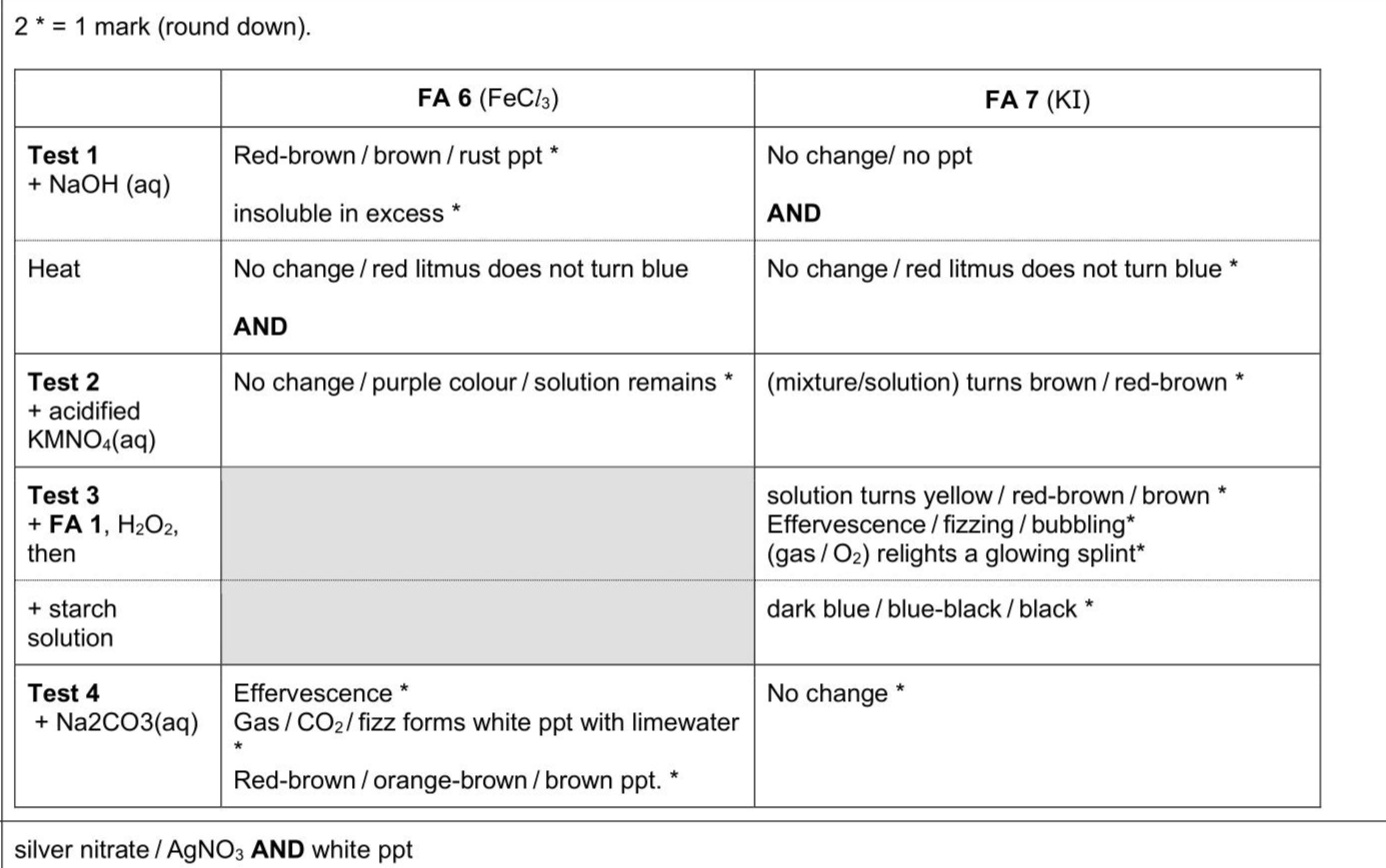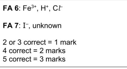 (b)FA 6 and FA 7 are both aqueous solutions of salts.Neither solution includes an ion that contains sulfur. FA 6 contains two cations and one anion.Two of the ions are listed in the Qualitative analysis notes. FA 7 contains one cation and one anion.One of the ions is listed in the Qualitative analysis notes. (i)Carry out the following tests and record your observations in Table 3.1. Use a 1 cm depth of FA 6 or FA 7 in a boiling tube for Test 1.Use a 1 cm depth of FA 6 or FA 7 in a test-tube for Tests 2, 3 and 4. [6] (ii) The anion in FA 6 does not contain nitrogen. Select one further reagent to identify the anion present in FA 6. Carry out a test with this reagent and record your observations in Table 3.2. (iii) Give the formulae of the ions present in FA 6 and FA 7. If you are unable to identify an ion from your tests, write 'unknown.' The ions present in FA 6 are and and . The ions present in FA 7 are and