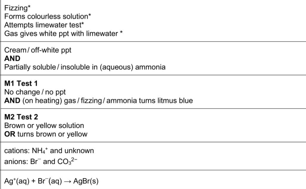 (b)FB 9 contains two anions and two cations,three of which are listed in the Qualitative analysis notes. (i)To a small spatula measure of FB 9 in a test-tube,add a 2 cm depth of dilute nitric acid. Record your observations. Keep the resulting solution for the test in(b)(ii). . . [2] (ii)To the solution from(b)(i),add a few drops of aqueous silver nitrate.Then add excess aqueous ammonia.Record your observations. . . [1] (iii) Make an aqueous solution of FB 9 by adding a 5 cm depth of distilled water to a spatula measure of FB 9 in a test-tube. Carry out the following tests on the aqueous solution of FB 9 and record your observations in Table 3.2. (iv) Use your observations in (b)(i), (b)(ii) and Table 3.2 to deduce the formulae of the cations and anions in FB 9. If you are unable to identify an ion, write 'unknown'. cations and anions and (v) Write an ionic equation for the reaction in (b)(ii). Include state symbols.