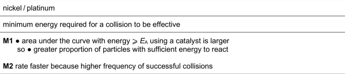 $$\(\mathrm{C}_{4} \mathrm{H}_{8}\)$$ reacts with an excess of $$\(\mathrm{H}_{2}\)$$ to produce $$\(\mathrm{C}_{4} \mathrm{H}_{10}\)$$. $$\[ \text { reaction } 1 \quad \mathrm{C}_{4} \mathrm{H}_{8}+\mathrm{H}_{2} \rightarrow \mathrm{C}_{4} \mathrm{H}_{10} \]$$ (i) Name a catalyst for reaction 1 . (ii) Define activation energy, $$\(E_{\mathrm{A}}\)$$. . (iii) The Boltzmann distribution for the reaction mixture in reaction 1 is shown in Fig. 3.1. Use the Boltzmann distribution to explain the effect of adding a catalyst on the rate of reaction. . . .