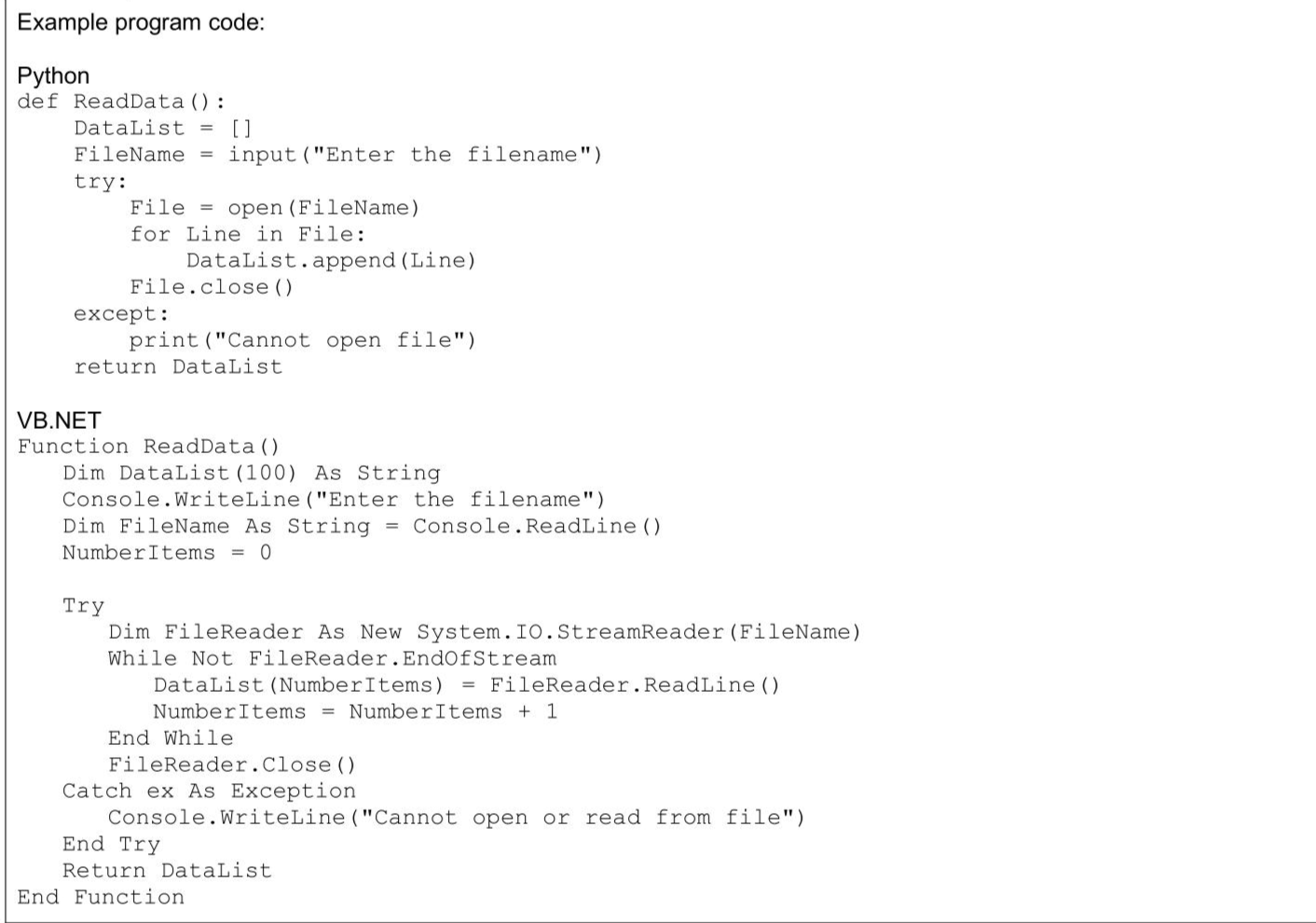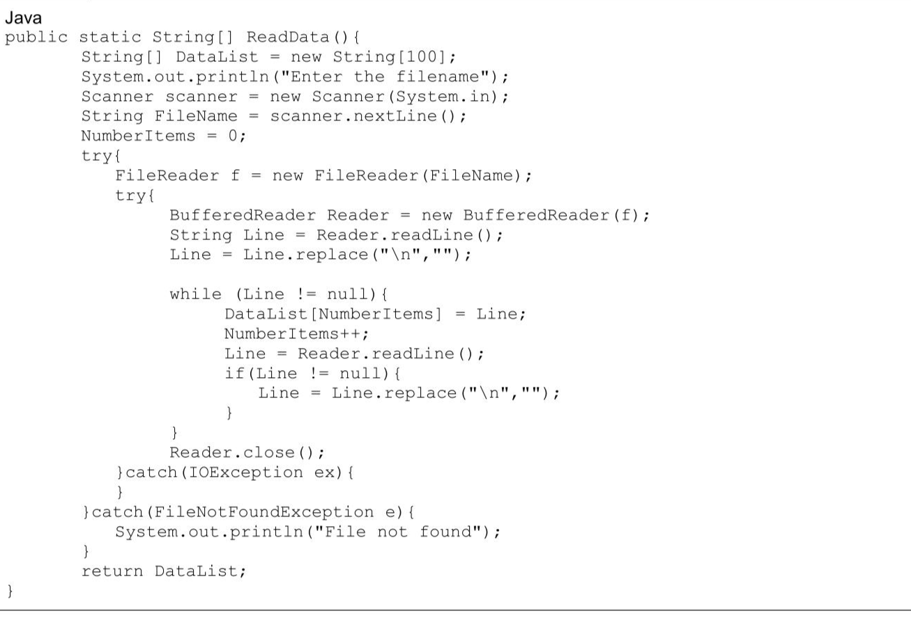 A program reads data from a text file, splits the data depending on its content and stores the separated data into different files. The text file TheData.txt contains 72 lines of data. Each line of data has an integer number and a string colour that are separated by a comma. For example, the first line in the file is: 10 , red The integer is 10 and the string is "red" The file contains six different colours: red, green, blue, orange, yellow, pink. The function ReadData () : - prompts the user to enter a filename and reads this filename from the user - opens the file and reads each line of data into a 1D array - returns the populated 1 D array. The function needs to work for a file that contains an unknown number of lines. Write program code for ReadData ()