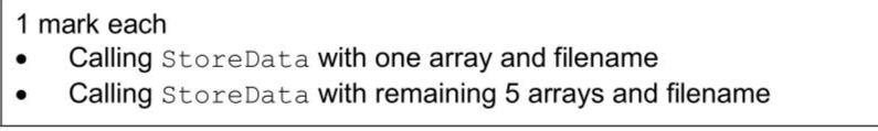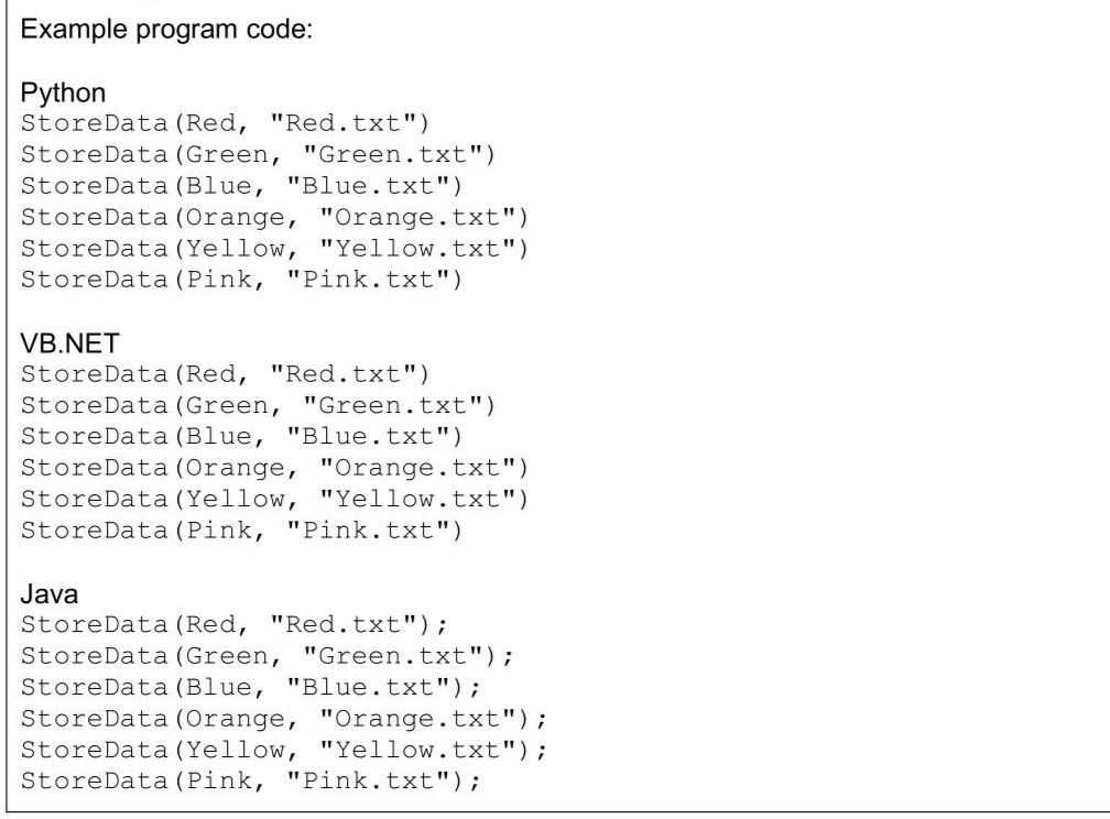A program reads data from a text file, splits the data depending on its content and stores the separated data into different files. The text file TheData.txt contains 72 lines of data. Each line of data has an integer number and a string colour that are separated by a comma. For example, the first line in the file is: 10 , red The integer is 10 and the string is "red" The file contains six different colours: red, green, blue, orange, yellow, pink. Each of the six colours has a blank text file where the numbers will be stored. The names of these six text files are: The procedure SplitData() needs amending to call StoreData() six times, with each of the six colour arrays and the name of the text file that corresponds to that colour. For example, StoreData () will be called with the red array and the file name "Red.txt" Write program code to amend SplitData ()