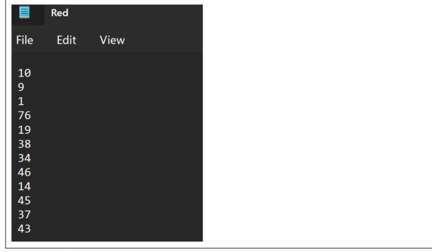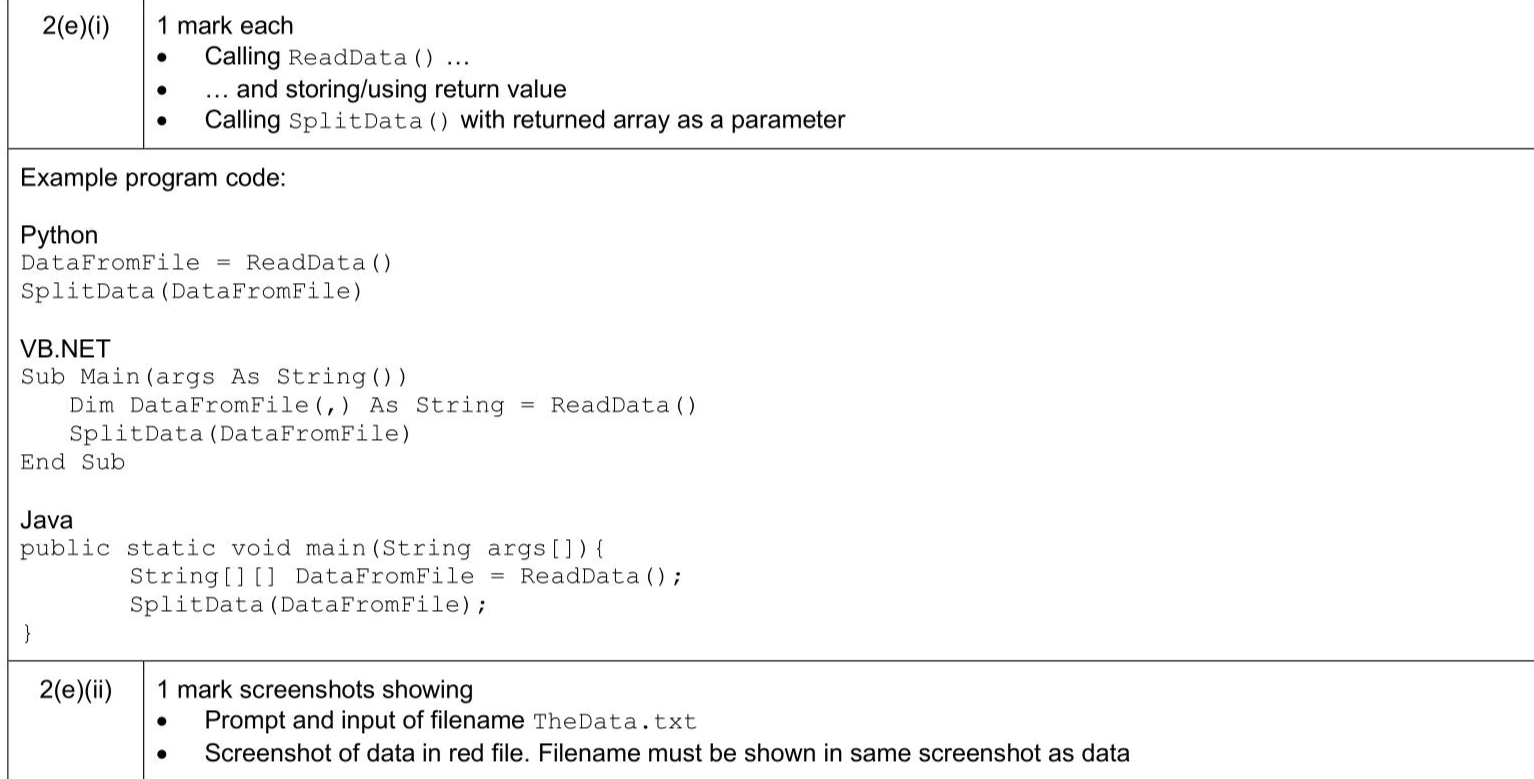 A program reads data from a text file, splits the data depending on its content and stores the separated data into different files. The text file TheData.txt contains 72 lines of data. Each line of data has an integer number and a string colour that are separated by a comma. For example, the first line in the file is: 10 , red The integer is 10 and the string is "red" The file contains six different colours: red, green, blue, orange, yellow, pink. The main program calls ReadData() and then SplitData() (i) Write program code for the main program. (ii) Test your program. Input the text "TheData.txt" when prompted. Take a screenshot of the output(s) and a screenshot showing the content of the file that stores the red numbers.