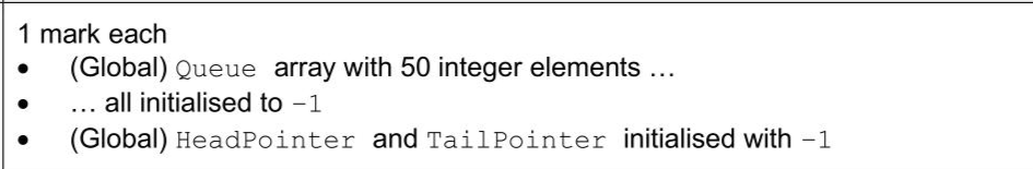 A program reads data from a text file and stores it in a queue. The linear queue queue is stored as a 1D array of up to 50 elements. The queue has the following pointers: - HeadPointer - this stores the index of the first element in the queue, initialised to -1 - TailPointer - this stores the index of the last element in the queue, initialised to - 1 Queue is a global array of 50 integers with all elements initialised to -1 in the main program. The two pointers are declared as global variables and initialised to -1 Write program code to declare and initialise Queue, HeadPointer and TailPointer