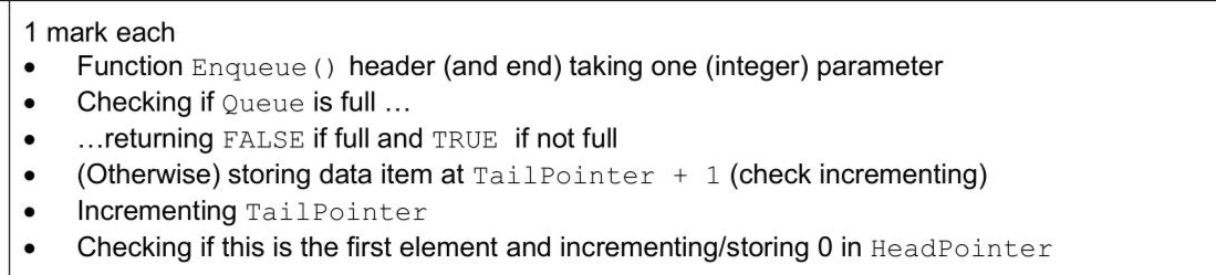 A program reads data from a text file and stores it in a queue. The linear queue queue is stored as a 1D array of up to 50 elements. The queue has the following pointers: - HeadPointer - this stores the index of the first element in the queue, initialised to -1 - TailPointer - this stores the index of the last element in the queue, initialised to - 1 The function Enqueue () : - takes an integer parameter to store in the next position in the queue - returns FALSE if the queue is full and the parameter cannot be stored in the queue - returns TRUE if the parameter is stored in the queue - updates the pointers where appropriate. Write program code for Enqueue ()