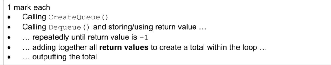 A program reads data from a text file and stores it in a queue. The linear queue queue is stored as a 1D array of up to 50 elements. The queue has the following pointers: - HeadPointer - this stores the index of the first element in the queue, initialised to -1 - TailPointer - this stores the index of the last element in the queue, initialised to - 1 The main program needs extending to call CreateQueue(). The main program then adds together all of the integers stored in the queue, using Dequeue() to access each integer. The total is then output. Write program code to extend the main program. (ii) Test your program. Take a screenshot of the output(s).