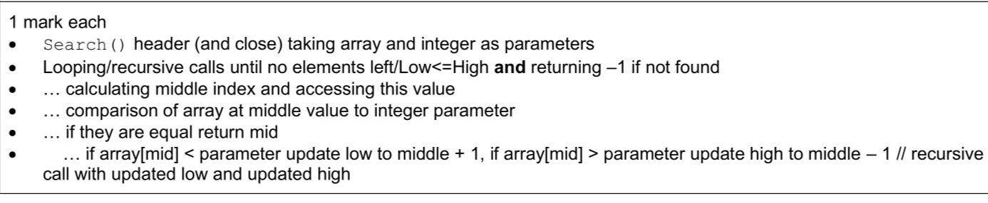 A program sorts the data in the 1D array DataArray and searches DataArray for specific values. DataArray stores 14 integer values and is declared local to the main program. The function Search () performs a binary search to find ItemToFind in DataArray The function takes two parameters: - DataArray, an array of integers - ItemToFind, an integer to find in DataArray The function returns: - the index of ItemToFind if it is in DataArray - -1 if ItemToFind is not in DataArray Write program code for Search () You must not use any inbuilt searching functions for your programming language.