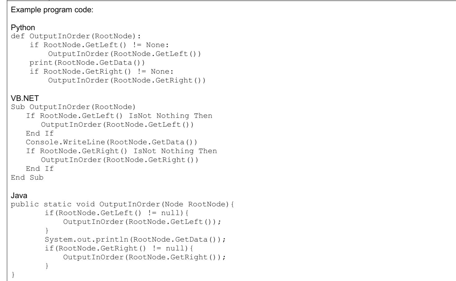 A program stores data in a binary tree that is designed using Object-Oriented Programming (OOP). The tree stores data in ascending numerical order, for example: The recursive procedure OutputInOrder () outputs the data stored in the binary tree in ascending numerical order. The procedure takes a Node object as a parameter and then: - checks if the left node is null. If there is a left node, the function calls itself with the left node - outputs the data of the current node - checks if the right node is null. If there is a right node, the function calls itself with the right node. Write program code for OutputInOrder ()