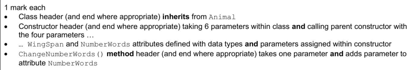 A program stores data about animals using Object-Oriented Programming (OOP). The class Animal stores the data about animals. The class Parrot inherits from the class Animal Parrot inherits the attributes from Animal and overrides the Description () method. The additional attributes and methods in the class Parrot are: (i) Write program code to declare the class Parrot, its constructor and the method ChangeNumberWords() Use your programming language appropriate constructor. If you are writing in Python, include attribute declarations using comments.