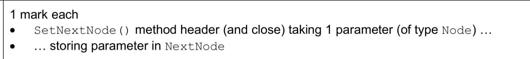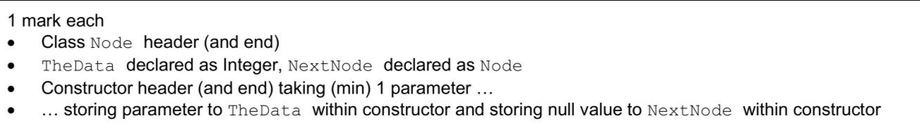A program stores data in a linked list that is designed using Object-Oriented Programming (OOP). The class Node stores data about the nodes. Write program code to declare the class Node and its constructor. Do not declare the other methods. Use your programming language appropriate constructor. If you are writing in Python, include attribute declarations using comments. (ii) Write program code for the two get methods. (iii) The method SetNextNode ( ) takes an object of type Node as a parameter. The method stores the parameter in the attribute NextNode Write program code for SetNextNode ()