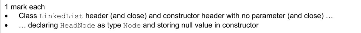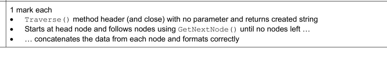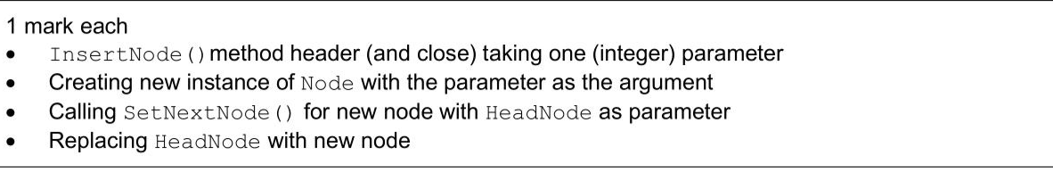 A program stores data in a linked list that is designed using Object-Oriented Programming (OOP). The class Node stores data about the nodes. The class LinkedList stores the linked list. (i) Write program code to declare the class LinkedList and its constructor. Do not declare the other methods. Use your programming language appropriate constructor. If you are writing in Python, include attribute declarations using comments. (ii) The method InsertNode(): - takes an integer as a parameter - creates a new node with the parameter as the integer data - uses the new node's method SetNextNode() to store the current HeadNode as the next node - replaces HeadNode with the current node. Write program code for InsertNode () (iii) The method Traverse () concatenates the integer data from the nodes in the linked list, starting with the node stored in HeadNode. The method returns the final string with each integer data separated with a space. Write program code for Traverse () (iv) The method RemoveNode ( ) takes an integer parameter to search for and remove from the linked list. The method first checks if the linked list is empty. If the linked list is empty the method returns FALSE If the linked list is not empty, the integer data in HeadNode is compared to the parameter. If it matches the parameter, HeadNode is changed to store the next node. If the parameter does not match, the nodes are followed until either: - the node with matching integer data is found. This node is removed, the appropriate nodes updated and TRUE returned or - none of the nodes contain matching integer data to the parameter. No nodes are removed and FALSE is returned. Write program code for RemoveNode ( )