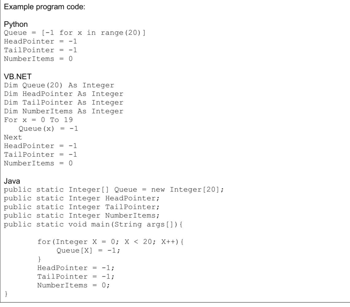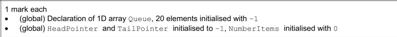 A program stores positive integers in a circular queue. The queue is stored as a global 1D array of 20 integers with the identifier queue. Each index is initialised with the data -1 The global variable HeadPointer, initialised to -1 , points to the first element in the queue. The global variable TailPointer, initialised to -1 , points to the last element in the queue. The global variable NumberItems, initialised to 0 , stores the number of items in the queue. Write program code to declare and initialise Queue, HeadPointer, TailPointer and NumberItems
