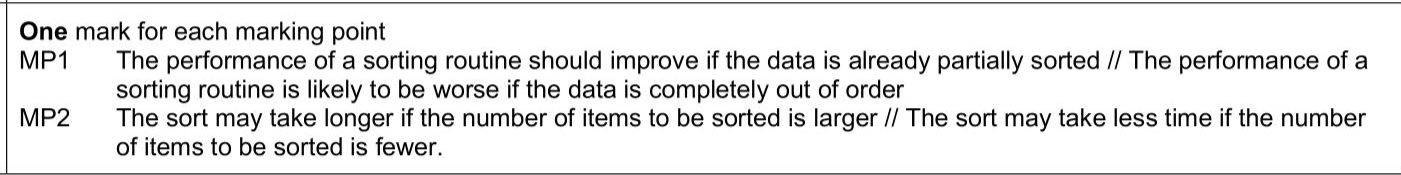 Describe two ways in which the performance of a sort routine is affected by the data to be sorted. 1 . 2 .