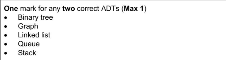 (a)An array is an Abstract Data Type(ADT). Identify two other ADTs. 1 2 [1]
