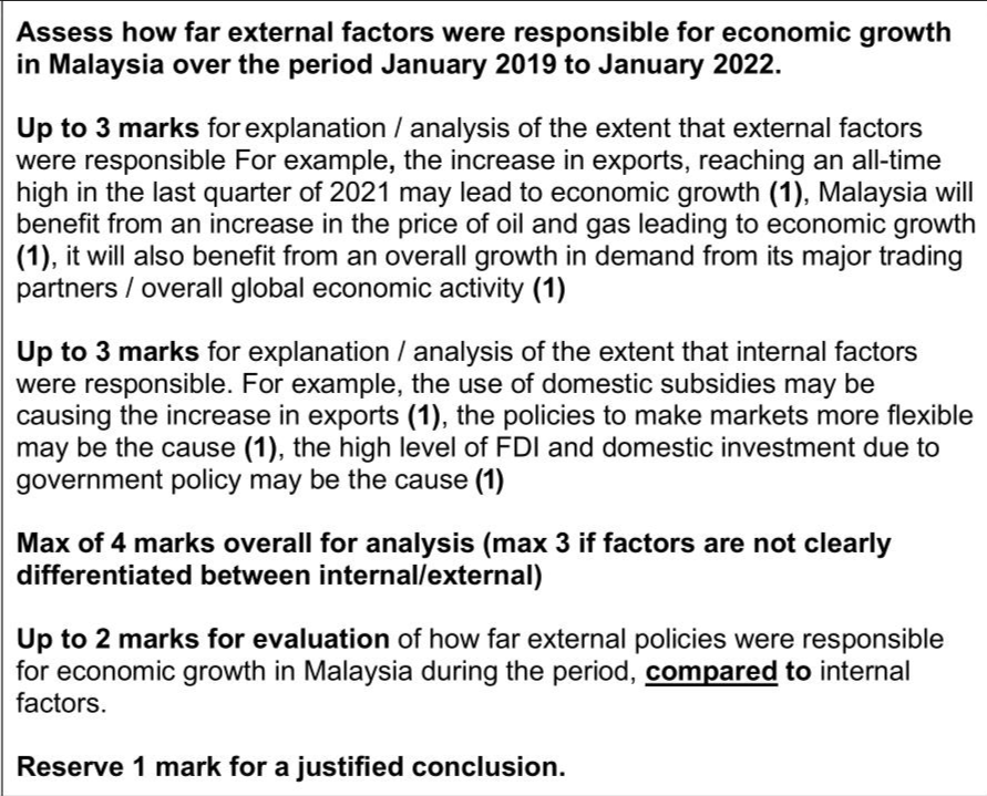 Annual growth in real GDP in Malaysia averaged $$\(5.2 \%\)$$ during the past ten years. There was a great deal of instability in GDP between July 2020 and July 2021, largely due to the COVID-19 pandemic. Economic growth was projected to grow by between $$\(5.5 \%\)$$ and $$\(6.5 \%\)$$ in 2022. The percentage change in real GDP per annum in Malaysia between January 2019 and January 2022 is shown in Fig. 1.1. Content removed due to copyright restrictions. Assess how far external factors were responsible for economic growth in Malaysia over the period January 2019 to January 2022.