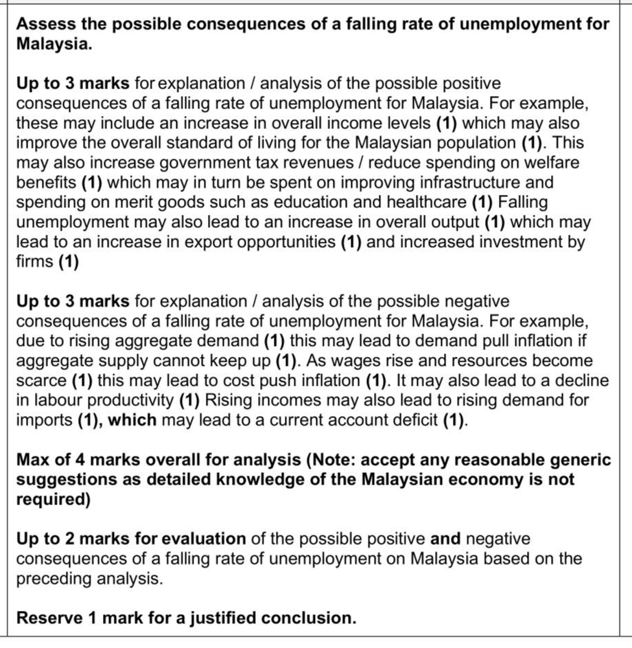 Annual growth in real GDP in Malaysia averaged $$\(5.2 \%\)$$ during the past ten years. There was a great deal of instability in GDP between July 2020 and July 2021, largely due to the COVID-19 pandemic. Economic growth was projected to grow by between $$\(5.5 \%\)$$ and $$\(6.5 \%\)$$ in 2022. The percentage change in real GDP per annum in Malaysia between January 2019 and January 2022 is shown in Fig. 1.1. Content removed due to copyright restrictions. Assess the possible consequences of a falling rate of unemployment for Malaysia.