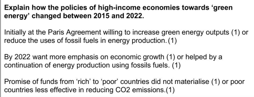 People often talk as if governments can easily control economic outcomes. Content removed due to copyright restrictions. High-income countries decided to focus on economic growth realising that it was essential to generate revenues and taxes needed to pay for costly investments, for example, the storage of renewable energy, required to reduce the use of fossil fuels. Sources: Irwin Stelzer, The Sunday Times, 29 January 2023 Ray Bourne, The Times, 9 February 2023 Explain how the policies of high-income economies towards 'green energy' changed between 2015 and 2022.