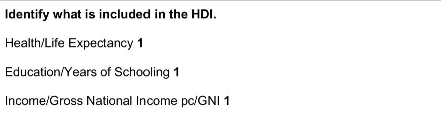Since 1971 Bangladesh has experienced significant economic development, moving from the low-income to the lower-middle-income country classification. Gross National Income (GNI) per capita at constant 2017 prices in United States dollars (\$) rose from \$2342 to \$5823 between 2000 and 2020. Over the same period, the country's Human Development Index (HDI) rose from 0.49 to 0.66 . During this period, Bangladesh underwent changes in employment as it moved from the agricultural sector to the manufacturing and services sectors. First, in agriculture, output increased by more than $$\(100 \%\)$$ whilst employment fell from $$\(65 \%\)$$ to $$\(38 \%\)$$ of the working population. This change was helped by innovation in crop irrigation, land preparation and harvesting, aided by the development of local industries to provide the capital equipment needed. A second source of economic development was the growth in the clothing industry producing ready-made garments (RMG) that contributed about $$\(11 \%\)$$ of Bangladesh's Gross Domestic Product (GDP) and employed 4.4 million workers of which 2.5 million were women (2020). The industry uses significant division of labour with production split into 10 or more processes, for example, cutting, sewing zips, assembly and packaging. The value of raw materials imported for the RMG industry was about half of the value of the industry's exports. Net exports from this sector stood at $$\(\$ 23\)$$ billion. This enabled Bangladesh to both import a wider range of goods and services and reduce the deficit on its balance of trade in goods. In 2020, there were more than 4000 RMG manufacturers in Bangladesh, differentiated by the quality of their products and the speed of their delivery. The RMG industry supplied more than 100 major US and European retailers. However, the RMG industry has critics who point to air and water pollution from the chemicals used in cotton growing and manufacturing clothes. The industry is also accused of employing child labour and of having poorly constructed factories. Sources: Bangladesh overview: World Bank, 11 April 2024 and Quarterly Review on Readymade Garments, Bangladesh Bank Research Department, 14 February 2023 Identify what is included in the HDI.