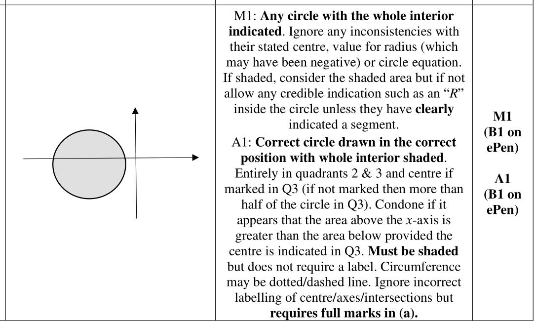 A transformation $$\(T\)$$ from the $$\(z\)$$-plane, where $$\(z=x+\mathrm{i} y\)$$, to the $$\(w\)$$-plane, where $$\(w=u+\mathrm{i} v\)$$ is given by $$\[ w=\frac{z-3}{2 \mathrm{i}-z} \quad z \neq 2 \mathrm{i} \]$$ The line in the $$\(z\)$$-plane with equation $$\(y=x+3\)$$ is mapped by $$\(T\)$$ onto a circle $$\(C\)$$ in the $$\(w\)$$-plane. The region $$\(y> x+3\)$$ in the $$\(z\)$$-plane is mapped by $$\(T\)$$ onto the region $$\(R\)$$ in the $$\(w\)$$-plane. (b) On a single Argand diagram (i) sketch the circle $$\(C\)$$ (ii) shade and label the region $$\(R\)$$ (2)