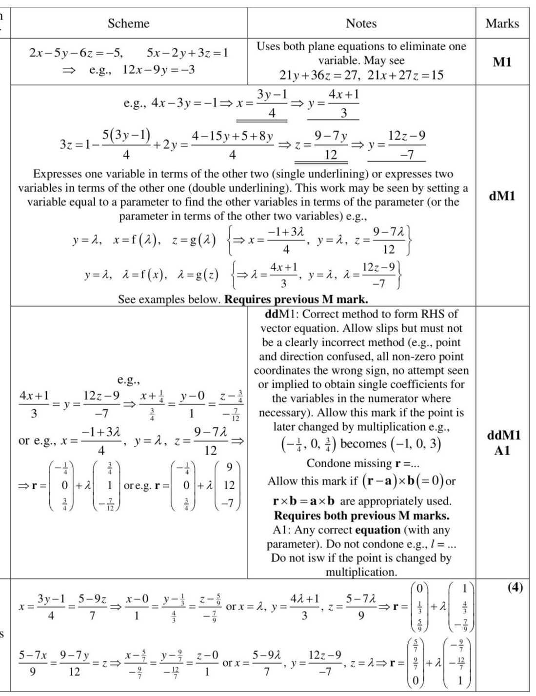 The plane $$\(\Pi_{1}\)$$ has vector equation $$\[ \mathbf{r}=\left(\begin{array}{l} 5 \\ 3 \\ 0 \end{array}\right)+s\left(\begin{array}{l} 3 \\ 0 \\ 1 \end{array}\right)+t\left(\begin{array}{r} 1 \\ -2 \\ 2 \end{array}\right) \]$$ where $$\(s\)$$ and $$\(t\)$$ are scalar parameters. The plane $$\(\Pi_{2}\)$$ has vector equation $$\(\mathbf{r} .\left(\begin{array}{r}5 \\ -2 \\ 3\end{array}\right)=1\)$$ (b) Determine a vector equation for the line of intersection of $$\(\Pi_{1}\)$$ and $$\(\Pi_{2}\)$$ Give your answer in the form $$\(\mathbf{r}=\mathbf{a}+\lambda \mathbf{b}\)$$, where $$\(\mathbf{a}\)$$ and $$\(\mathbf{b}\)$$ are constant vectors and $$\(\lambda\)$$ is a scalar parameter. (4)
