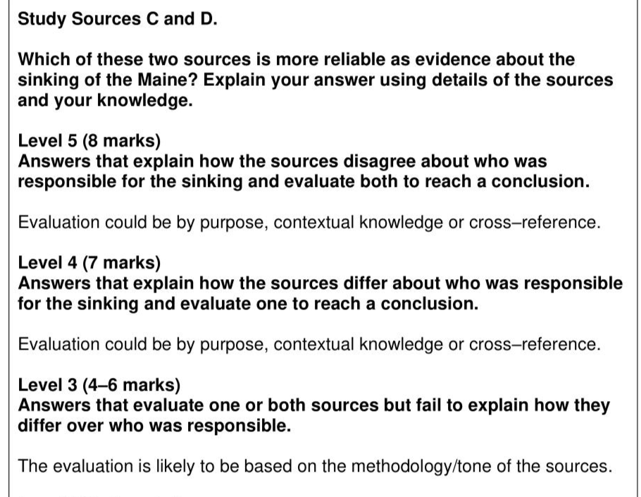 Did Americans blame Spain for the sinking of the Maine? Study the Background Information and the sources carefully, and then answer all parts of Question 1. Background Information As soon as the American warship USS Maine exploded and sank in the Cuban port of Havana on 15 February 1898, newspapers and politicians in the United States began to blame the Spanish. Even before there was any evidence, claims were made that a Spanish mine (a floating bomb) had destroyed the warship. President McKinley was more cautious and set up a court of inquiry. Popular newspapers, led by the New York Journal and the New York World, also made claims about Spanish cruelty towards the Cubans who were fighting for independence from Spanish rule, and demanded that America go to war to free Cuba. Did all Americans blame the Spanish for the sinking of the Maine? SOURCE A This has been a busy day. We have been overwhelmed with callers, expressing sympathy. The entire staff of the Spanish embassy called to express regrets. The records show that 253 men were killed. There is an intense difference of opinion as to the cause of the sinking of the Maine. The opinion of each individual is determined by his bias. If he is a conservative, he is sure that it was an accident; if he is a jingo, he is sure it was deliberate. My own judgement is that it was the result of an accident such as a ship of war carrying powerful explosives is likely to experience. John D Long, US Secretary of the Navy, writing in his journal, 16 February 1898. Long was the member of the government in charge of the navy. A jingo was a strong supporter of war against Spain for patriotic reasons. SOURCE B It would be wasting our time to discuss the American theory that the Maine was blown up by the explosion of a mine connected by wires to our shipyard. Spain's honour stands too high to be harmed by the squeamish drivel of those nasty American jingoes. The best way to get rid of these toads is to crush them. The American jingoes believe that all men are made like themselves. It was President McKinley's duty to see that Spain should not be so grossly insulted by the jingo newspapers. Since he did not do so, he is as much a jingo as the jingo newspapers. We must declare that the claim that the Maine was blown up by us is laughable. What reason could we have for destroying the American battleship? Even ten ships would not enable the United States to triumph over Spain. From a Spanish newspaper published in Madrid, 1 March 1898. SOURCE C To five hundred thousand Cubans starved or otherwise murdered by the Spanish have been added an American battleship and three hundred American sailors lost as the direct result of the policy of our government. The Spanish claim it was an accident. If it was an accident, it was remarkably convenient for Spain. Two years ago our naval superiority over Spain was overwhelming. Our government allowed Spain to overcome that disadvantage by building enough ships to bring its navy up to equality with ours. This 'accidental' destruction of the American fleet means it will not take long for Spain's naval strength to overtake our own. If it be found that Spain caused this disaster, no power will be able to restrain the American people from taking a justifiable revenge. All the circumstances fix the burden of proof upon Spain. The Maine was lying in one of its harbours, under the guns of its fortresses. The destruction of the Maine strengthens Spain in the event of the war that Spain desires. The chances against such a destruction by accident were millions to one, and yet it occurred. The investigations must clearly prove Spain's innocence or its guilt will be assumed. From the New York Journal, 17 February 1898. SOURCE D INSPECTION OF THE MAINE WILL DECIDE Divers Will Inspect the Ship to Find Out Whether the Explosion Was From the Outside or Inside Magazines of Warships Sometimes Blow Up Because of Too Much Heat Inside - Hard to Blow Up the Magazine from the Outside The warship Maine was destroyed in Havana harbour last night. Secretary Long was asked whether he thought this was the work of the enemy. He replied: 'I do not. I am influenced by the fact that Captain Sigsbee has not yet reported. He is waiting to write a full report. So long as he has not made a decision, I certainly cannot. I should think from the signs, however, that there was an accident - that the magazine exploded. How that came about I do not know.' A naval officer, who knows a great deal about warships, dismissed the idea that the Maine had been destroyed on purpose. He said that fires sometimes started in the coal bunkers, and he told of such a fire very close to the magazine on board another warship. The fire became so hot that the steel wall between the fire and the ammunition melted. He did not believe that the Spanish had either the information or the equipment necessary to blow up the magazine. From the New York Times, 17 February 1898. The magazine is where the ship's ammunition is stored. Captain Sigsbee was captain of the Maine. SOURCE E SOURCE F Now answer all parts of Question 1. You may use any of the sources to help you answer the questions, in addition to those sources which you are told to use. In answering parts (a)-(e) you should use your knowledge of the topic to help you interpret and evaluate the sources. Study Sources C and D. Which of these two sources is more reliable as evidence about the sinking of the Maine? Explain your answer using details of the sources and your knowledge.