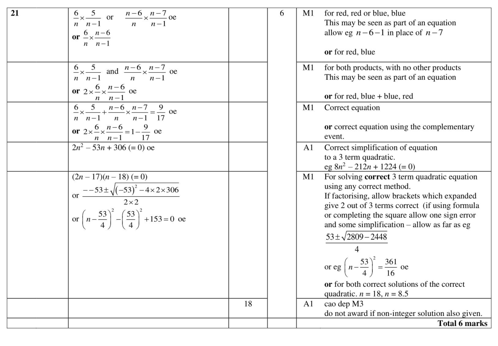 A bag contains $$\(n\)$$ beads. 6 of the beads are red and the rest are blue. Ravi is going to take at random 2 beads from the bag. The probability that the 2 beads will be of the same colour is $$\(\frac{9}{17}\)$$ Using algebra, and showing each stage of your working, calculate the value of $$\(n\)$$. $$\[ n=. \]$$