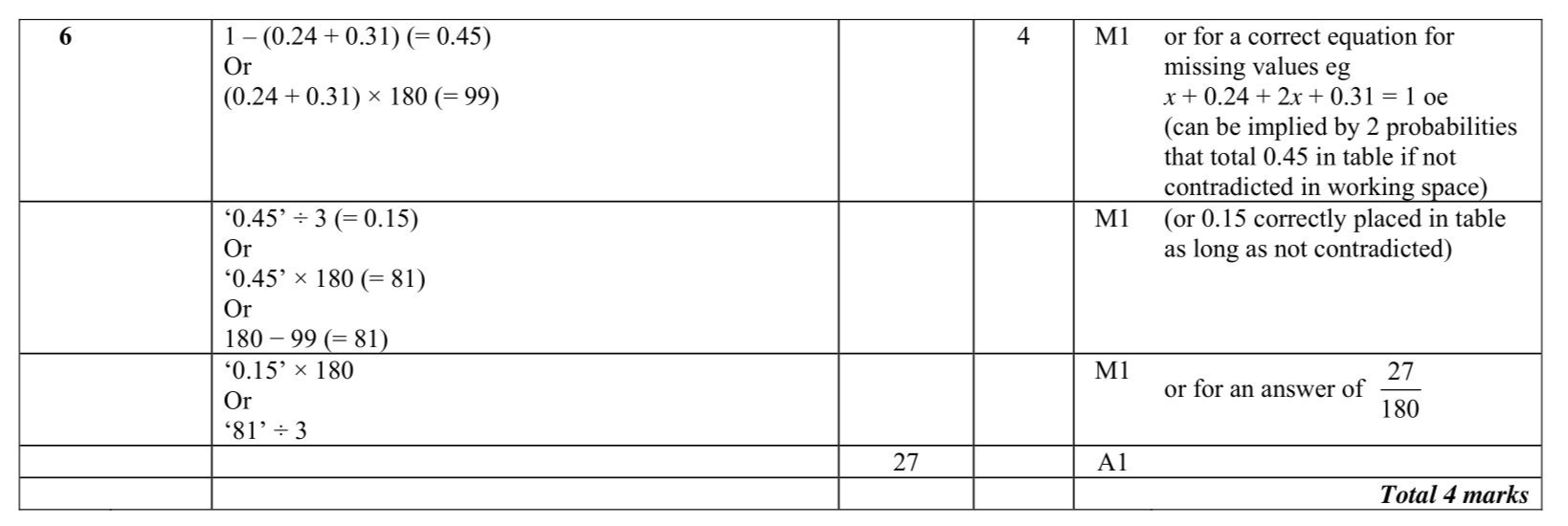 A bag contains only red beads, blue beads, green beads and yellow beads. The table gives the probabilities that, when a bead is taken at random from the bag, the bead will be blue or the bead will be yellow. The probability that the bead will be green is twice the probability that the bead will be red. Sofia takes at random a bead from the bag. She writes down the colour of the bead and puts the bead back into the bag. She does this 180 times. Work out an estimate for the number of times she takes a red bead from the bag.