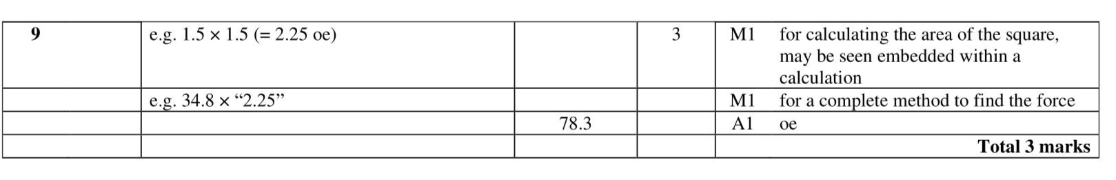 A box is put on a horizontal table. The face of the box in contact with the table is a square of side 1.5 metres. The pressure on the table due to the box is 34.8 newtons $$\(/ \mathrm{m}^{2}\)$$ Work out the force exerted by the box on the table. newtons