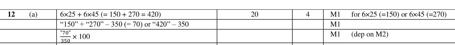 A company makes cars. In 2016 , the company made 350 cars. In the first 6 months of 2017, the company made 25 cars each month. In the last 6 months of 2017, the company made 45 cars each month. (a) Work out the percentage increase in the number of cars the company made from 2016 to 2017 $$\(\%\)$$ (4)