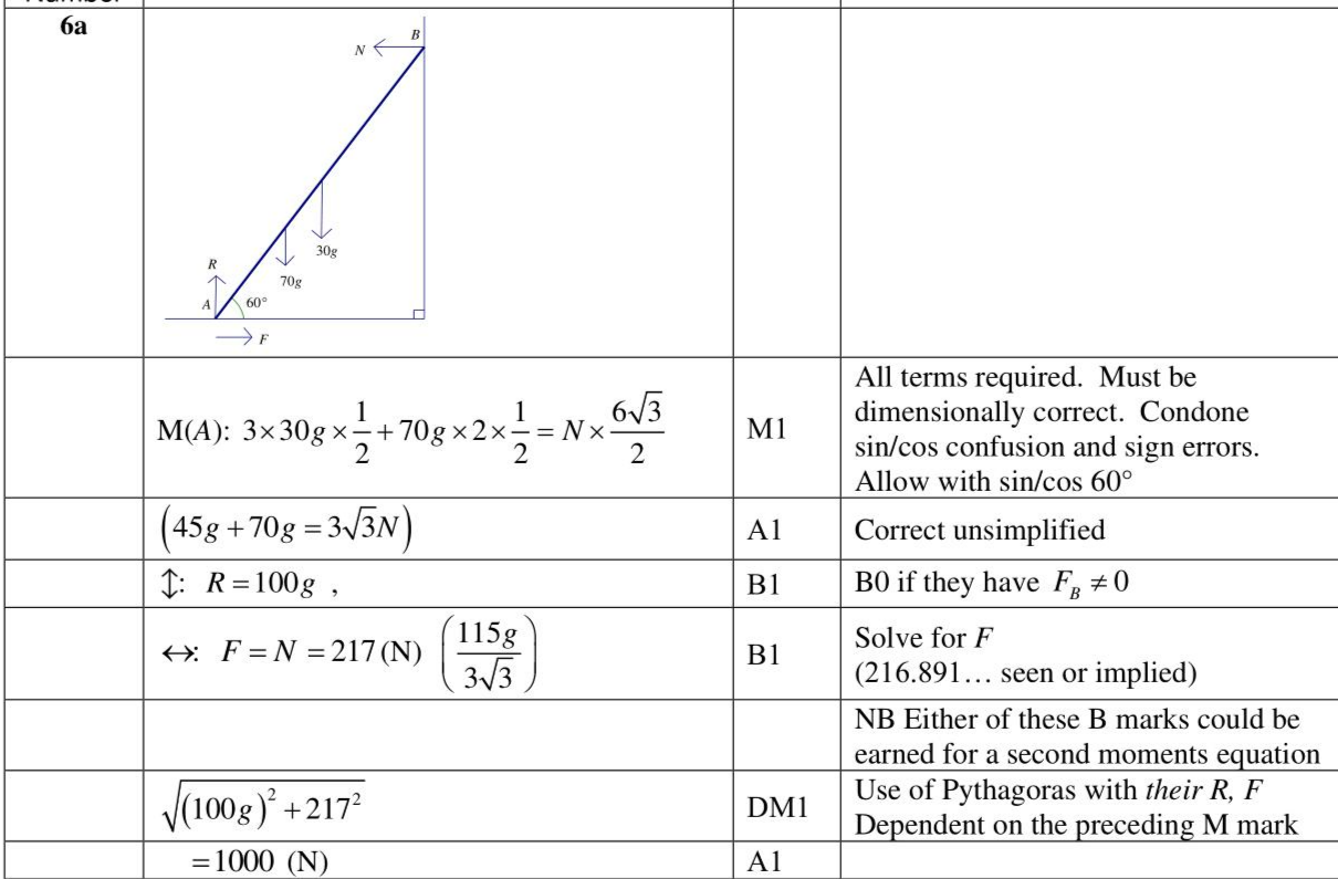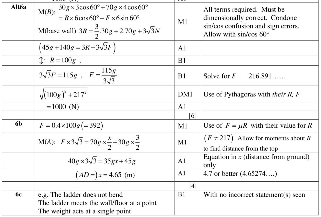 A ladder $$\(A B\)$$ has length $$\(6 \mathrm{~m}\)$$ and mass $$\(30 \mathrm{~kg}\)$$. The ladder rests in equilibrium at $$\(60^{\circ}\)$$ to the horizontal with the end $$\(A\)$$ on rough horizontal ground and the end $$\(B\)$$ against a smooth vertical wall, as shown in Figure 3. A man of mass $$\(70 \mathrm{~kg}\)$$ stands on the ladder at the point $$\(C\)$$, where $$\(A C=2 \mathrm{~m}\)$$, and the ladder remains in equilibrium. The ladder is modelled as a uniform rod in a vertical plane perpendicular to the wall. The man is modelled as a particle. (a) Find the magnitude of the force exerted on the ladder by the ground. (6) The man climbs further up the ladder. When he is at the point $$\(D\)$$ on the ladder, the ladder is about to slip. Given that the coefficient of friction between the ladder and the ground is 0.4 (b) find the distance $$\(A D\)$$. (4) (c) State how you have used the modelling assumption that the ladder is a rod. (1)