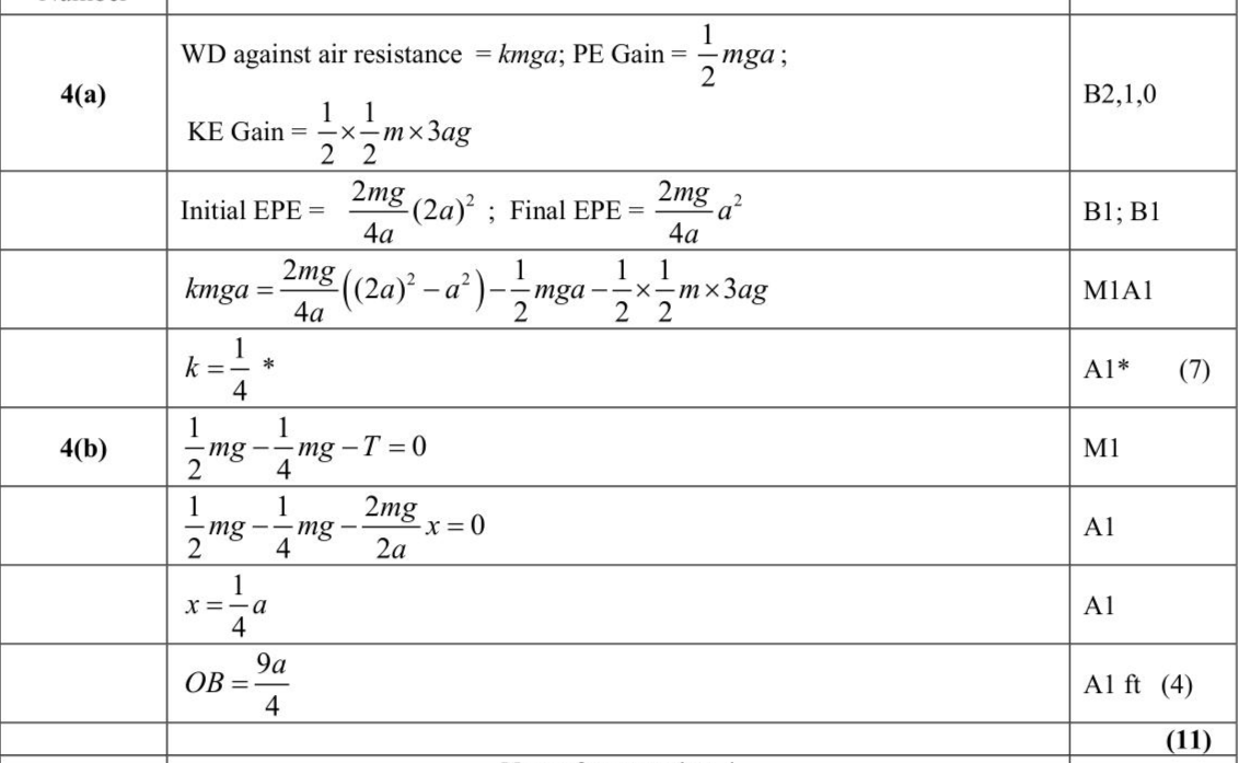 A light elastic string has natural length $$\(2 a\)$$ and modulus of elasticity $$\(2 m g\)$$. One end of the elastic string is attached to a fixed point $$\(O\)$$. A particle $$\(P\)$$ of mass $$\(\frac{1}{2} m\)$$ is attached to the other end of the elastic string. The point $$\(A\)$$ is vertically below $$\(O\)$$ with $$\(O A=4 a\)$$. Particle $$\(P\)$$ is held at $$\(A\)$$ and released from rest. The speed of $$\(P\)$$ at the instant when it has moved a distance $$\(a\)$$ upwards is $$\(\sqrt{3 a g}\)$$ Air resistance to the motion of $$\(P\)$$ is modelled as having magnitude $$\(k m g\)$$, where $$\(k\)$$ is a constant. Using the model and the work-energy principle, (a) show that $$\(k=\frac{1}{4}\)$$ (7) Particle $$\(P\)$$ is now held at $$\(O\)$$ and released from rest. As $$\(P\)$$ moves downwards, it reaches its maximum speed as it passes through the point $$\(B\)$$. (b) Find the distance $$\(O B\)$$. (4)