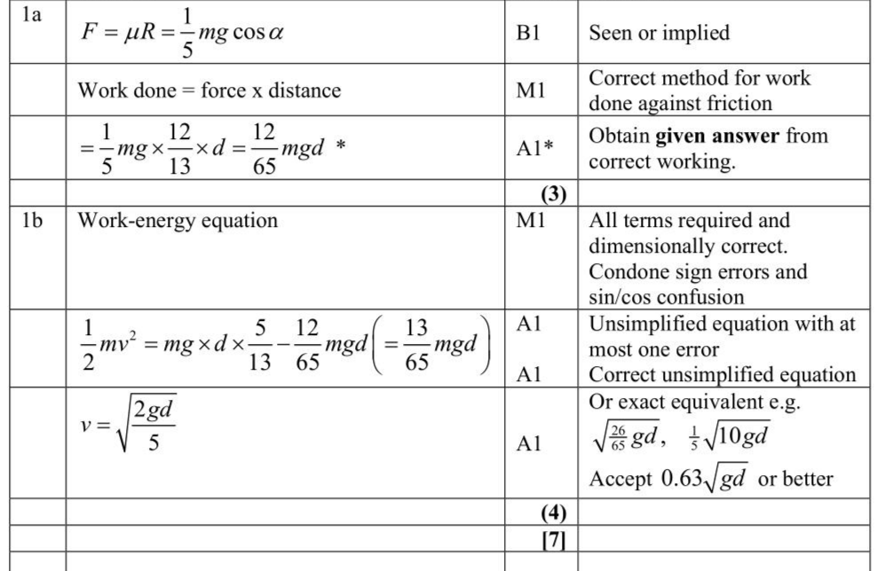 A particle of mass $$\(m\)$$ is held at rest at a point $$\(A\)$$ on a rough plane. The plane is inclined at an angle $$\(\alpha\)$$ to the horizontal, where $$\(\tan \alpha=\frac{5}{12}\)$$ The coefficient of friction between the particle and the plane is $$\(\frac{1}{5}\)$$ The points $$\(A\)$$ and $$\(B\)$$ lie on a line of greatest slope of the plane, with $$\(B\)$$ above $$\(A\)$$, and $$\(A B=d\)$$, as shown in Figure 1. The particle is pushed up the line of greatest slope from $$\(A\)$$ to $$\(B\)$$. (a) Show that the work done against friction as the particle moves from $$\(A\)$$ to $$\(B\)$$ is $$\(\frac{12}{65} m g d\)$$ (3) The particle is then held at rest at $$\(B\)$$ and released. (b) Use the work-energy principle to find, in terms of $$\(g\)$$ and $$\(d\)$$, the speed of the particle at the instant it reaches $$\(A\)$$. (4)