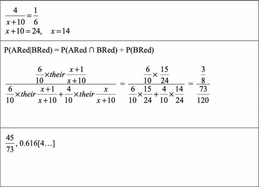 Box $$\(A\)$$ contains 6 red balls and 4 blue balls. Box $$\(B\)$$ contains $$\(x\)$$ red balls and 9 blue balls. A ball is chosen at random from box $$\(A\)$$ and placed in box $$\(B\)$$. A ball is then chosen at random from box $$\(B\)$$. It is given that the probability that both balls chosen are blue is $$\(\frac{1}{6}\)$$. Find the probability, correct to 3 significant figures, that the ball chosen from box $$\(A\)$$ is red given that the ball chosen from box $$\(B\)$$ is red. .................................................................................................................................................... .................................................................................................................................................... .................................................................................................................................................... .................................................................................................................................................... .................................................................................................................................................... .................................................................................................................................................... .................................................................................................................................................... .................................................................................................................................................... .................................................................................................................................................... .................................................................................................................................................... .................................................................................................................................................... .................................................................................................................................................... .................................................................................................................................................... .................................................................................................................................................... .................................................................................................................................................... .................................................................................................................................................... .................................................................................................................................................... .................................................................................................................................................... .................................................................................................................................................... .................................................................................................................................................... .................................................................................................................................................... .................................................................................................................................................... .................................................................................................................................................... ....................................................................................................................................................